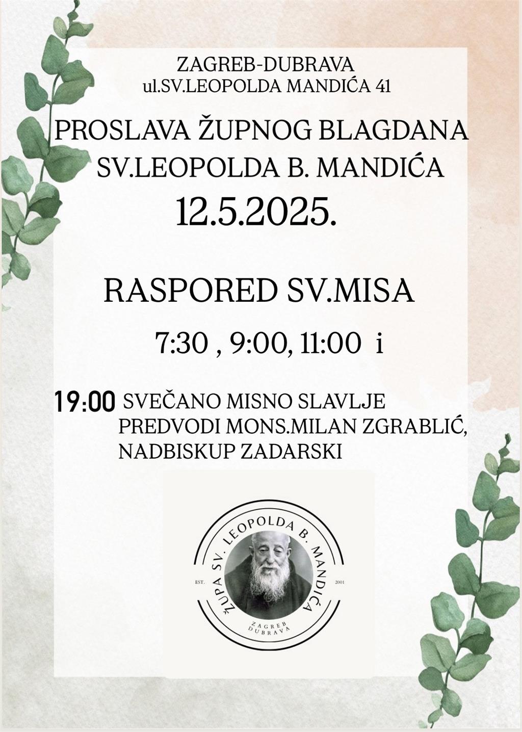 Župni blagdan sv. Leopolda Bogdana Mandića bit će proslavljen 12. svibnja u Župi sv. Leopolda Mandića, Zagreb-Dubrava, misnim slavljima u 7.30, 9, 11 i 19 sati. Svečano misno slavlje u 19 sati predvodit će zadarski nadbiskup mons. Milan Zgrablić.