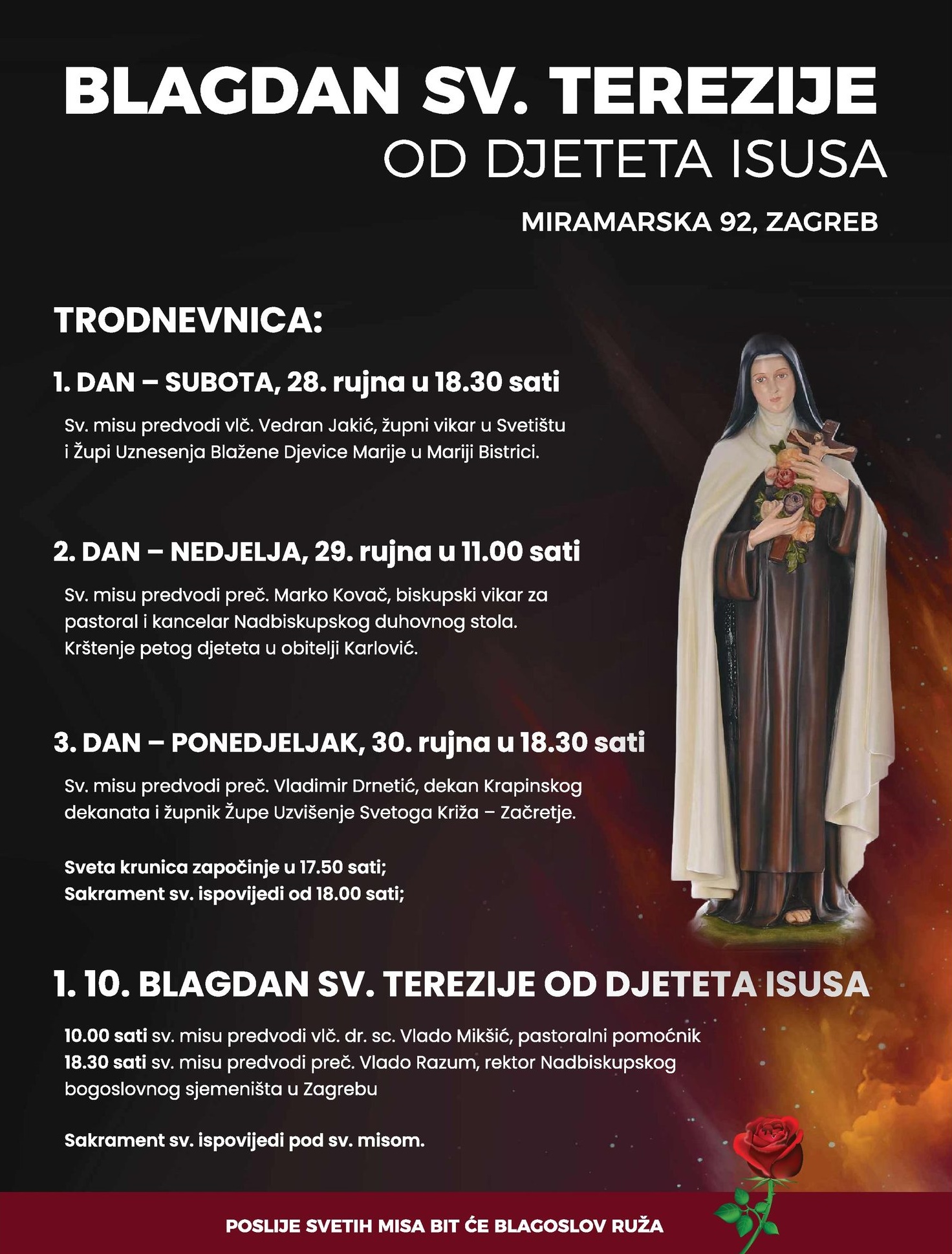 Župa sv. Terezije od Djeteta Isusa proslavit će svoj župni blagdan u utorak 1. listopada 2024. Svečano misno slavlje u 18.30 predvodit će preč. Vlado Razum, rektor Nadbiskupskog bogoslovnog sjemeništa u Zagrebu.
