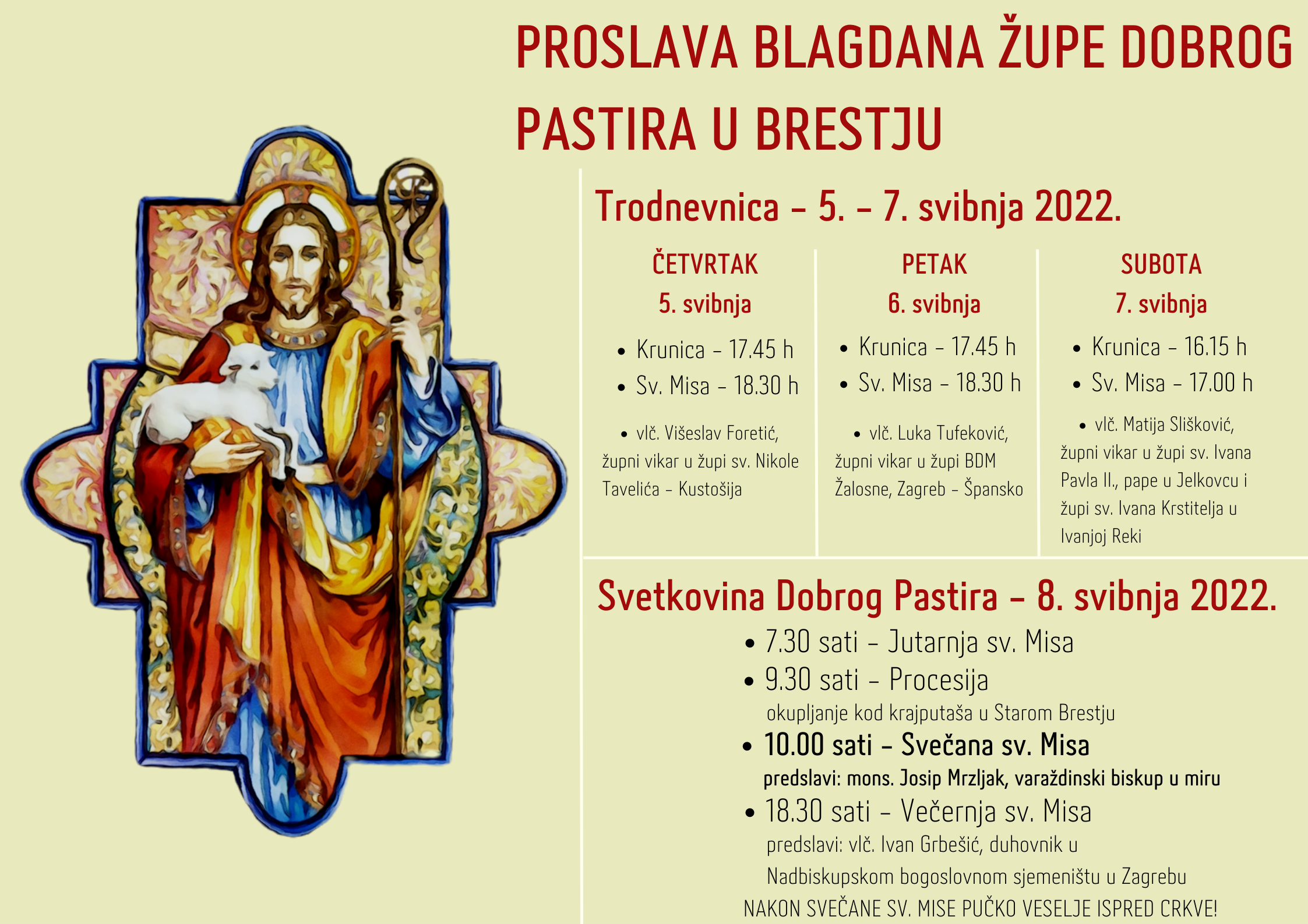 Središnja proslava započinje u 9.30 sati formiranjem procesije koja će biti od križa krajputaša u Starom Brestju do župne crkve. Svečano misno slavlje u 10 sati predslaviti će mons. Josip Mrzljak, varaždinski biskup u miru. Nakon dvije godine pauze nakon svete mise bit će i pučko veselje.