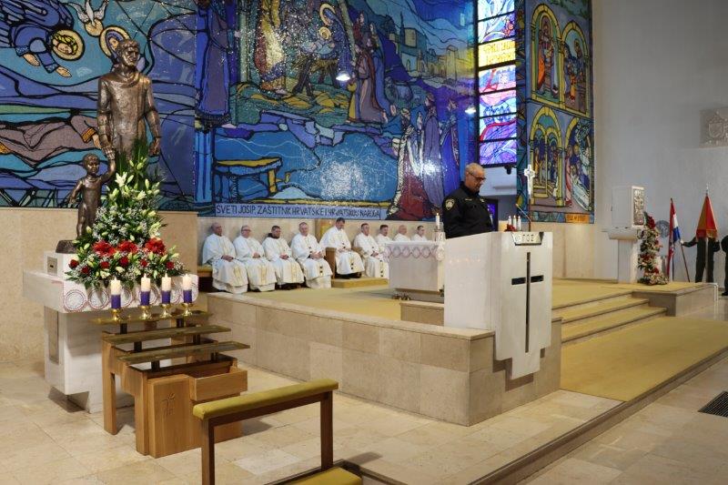 Obraćajući se pripadnicima Ministarstva unutarnjih poslova i drugih redarstvenih službi, propovjednik je rekao: „Poštovani pripadnici Ministarstva unutarnjih poslova, vama je povjerena zaštite hrvatskog naroda i svih građana koji žive u Hrvatskoj, da kroz provođenja zakona i humanog djelovanja, čuvate Domovinu i sve njezine građane te sve one koji se nađu na teritoriju Republike Hrvatske. Pozvani ste da budete čuvari naše sadašnjosti i budućnosti. Vi vašu službu vršite poput svetog Josipa: tiho i ustrajno, osluškujete glas i donosite prave odluke kad opasnosti nadođu. Prvi ste kad prijeti opasnost; prvi ste kad se dogodi nasilje u obitelji i društvu, prvi ste da čuvate dostojanstvo svake ljudske osobe, i sve to tiho i bez velike halabuke. Zato vam želimo reći hvala kroz molitvu Bogu za vas i vaše obitelji koje zajedno s vama nose teret vaše službe. Kao što je Bog povjerio početke ljudskog spasenja brižnoj skrbi sv. Josipa, tražeći od njega prihvaćanje volje Božje kroz prihvaćanje Marije, te da se nadahnjuje u služenju Utjelovljenoj Riječi, tako traži od nas da idemo tim istim putem. Neka nas na tom putu prati zagovor sv. Josipa i bl. Alojzija Stepinca i bl. Miroslava Bulešića.“