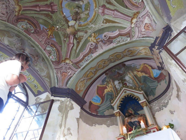 U apsidi, koja zaokružuje oltar s drvenim kipom Majke Božje žalosne, naslikao je crveno srce, kojem se klanjaju anđeli.