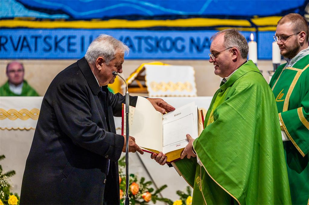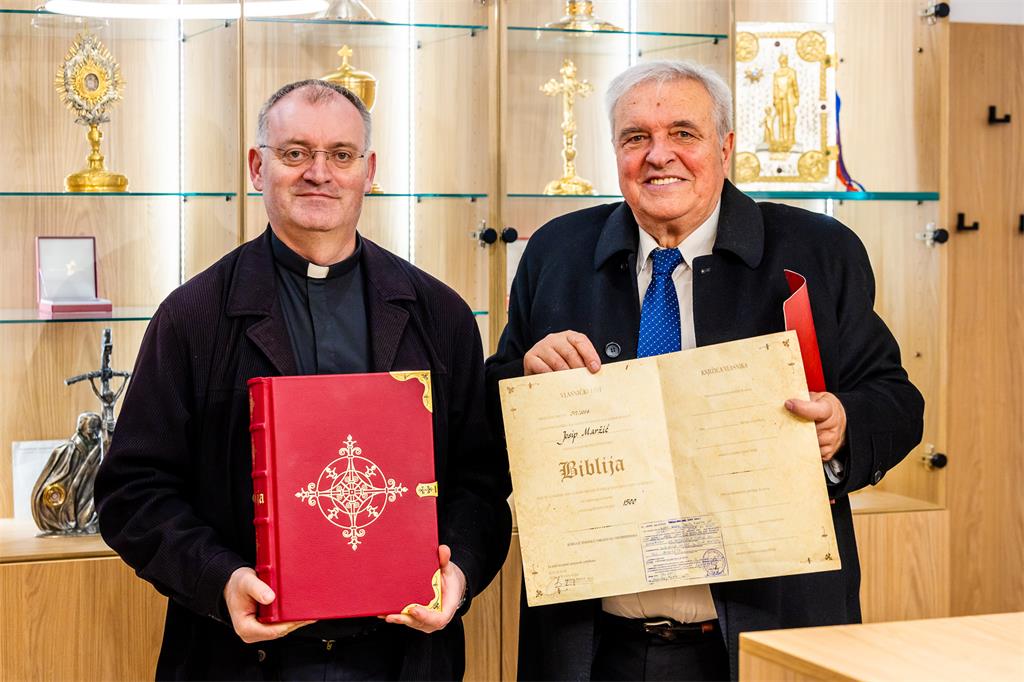"Prije dosta godina, za vrijeme pontifikata svetog Ivana Pavla II., štampana je 'Zlatna Biblija' u 1500 primjeraka na hrvatskom jeziku opremljena vrhunskim reprodukcijama slikovnih umjetničkih biblijskih prikaza. Kako sam poznavao ljude iz organizacijskog odbora, tako sam im predložio da upravo ja otkupim prvi primjerak tog posebnog izdanja Biblije. Tada su mi odgovorili da je prvi primjerak rezerviran za samog papu Ivana Pavla II. Onda sam zatražio da otkupim zadnji odnosno 1500. primjerak. Iako ga tada još nisu ni otisnuli, ja sam ga rezervirao i naravno kupio i čuvao ga kod svoje obitelji sve do danas. Sve ove godine dobivao sam više ponuda za otkup zadnjeg primjerka 'Zlatne Biblije'. Ni sam ne znam zašto se nisam htio od nje odvojiti. Očito ju je Bog odredio da bude ovdje u ovom svetištu sv. Josipa, zaštitnika naše domovine Hrvatske. I evo, ovu 'Zlatnu Bibliju', 1500. zadnji primjerak ovog izdanja, dragi moj mons. Antune Sente, predajem Vama kao čuvaru hrvatskog Nacionalnog svetišta sv. Josipa u Karlovcu, da je čuvate te bude dragom Bogu na slavu, a hrvatskom narodu na spas i blagoslov. Uz sam dar dostavljam i vlasnički list ovjeren kod javnog bilježnika. Uvjeren sam da je sada ova 'Zlatna Biblija' konačno na pravom mjestu. Hvala ti Bože, ovo je za mene izniman događaj", zaključio je gospodin Maržić.