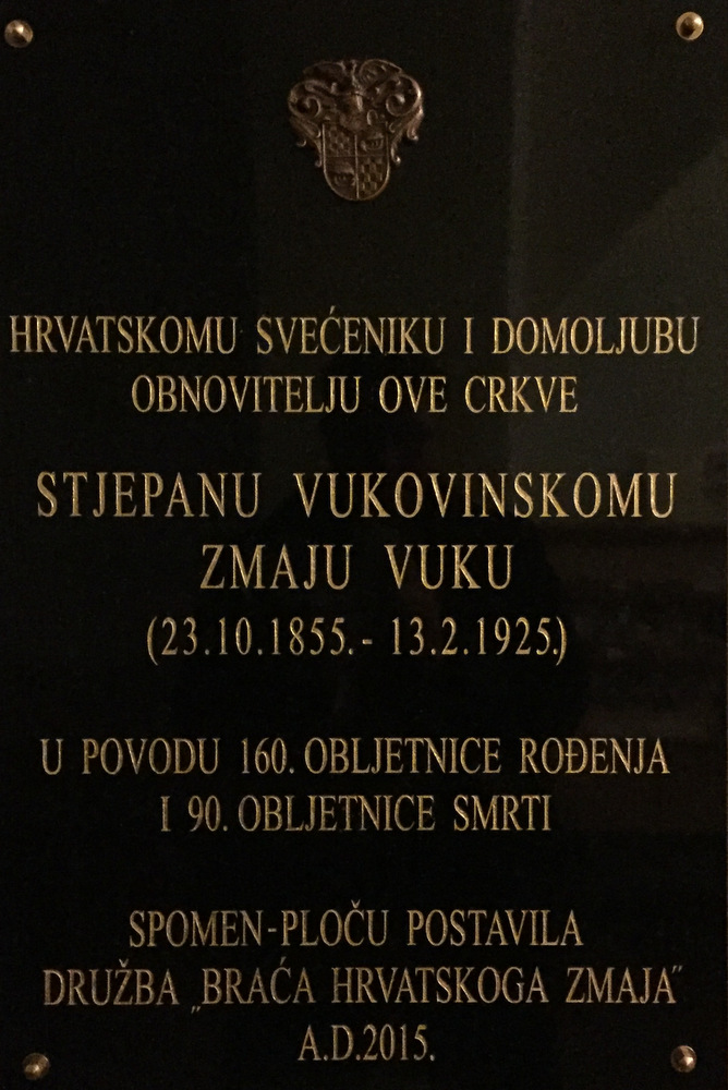 Ploča je postavljena na lijevom potpornom stupu podno kora, dok se na desnoj strani nalazi ploča postavljena 27. rujna 1903. godine, u spomen na posvetu crkve, koju „na mjestu prijašnje podigoše vlastitim glavnicama i prinosima područnih kapela BDM Jeruzalemske, sv. Florijana i sv. Triju Kralja te prilozima pobožnih darovatelja“ a posveti zagrebački nadbiskup Jurja Posilovića.