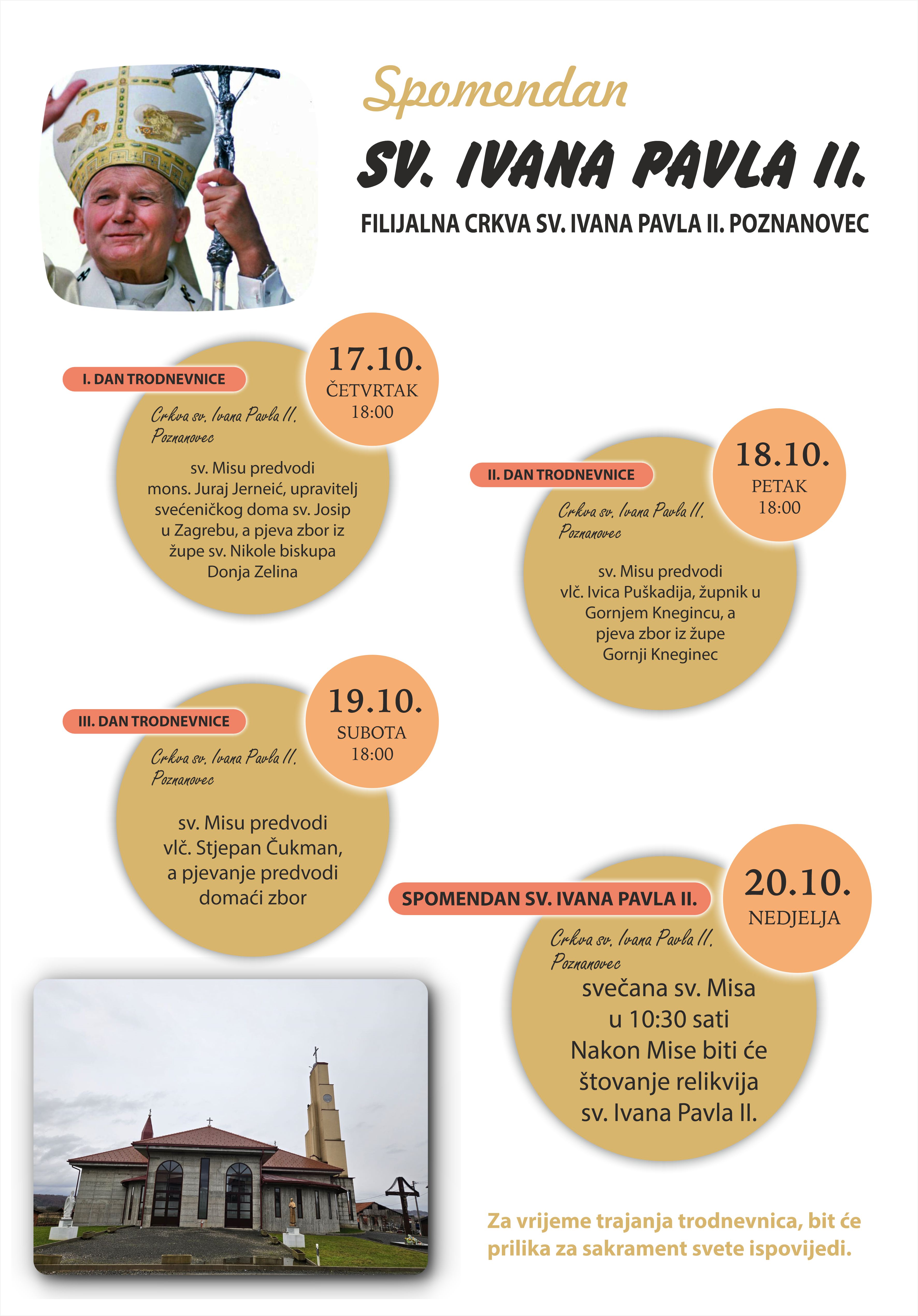 U Župi Bezgrešnog začeća Blažene Djevice Marije u Maču, u filijalnoj crkvi u Poznanovcu spomendan sv. Ivana Pavla II. proslavit će se svečanim misnim slavljem u nedjelju 20. listopada u 10.30 sati.