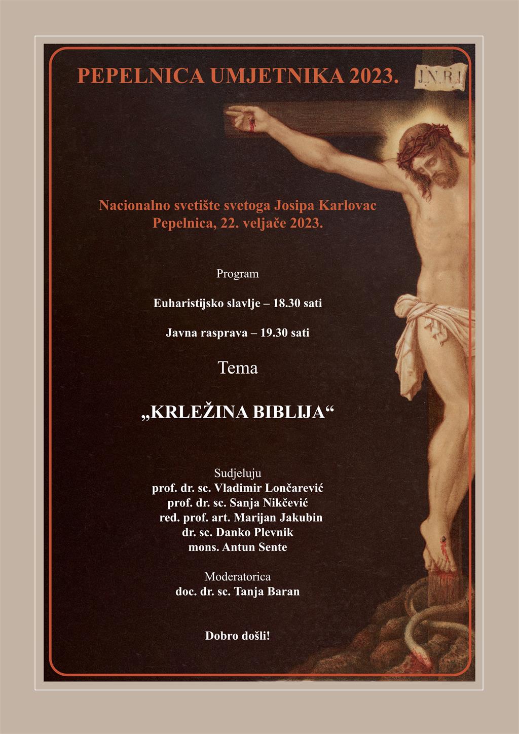 „Pepelnica umjetnika“, molitva s umjetnicima i za njih te rasprava s umjetnicima o vjeri i umjetnosti, održat će se deveti put u Nacionalnom svetištu svetog Josipa u Karlovcu na Pepelnicu u srijedu 22. veljače. Misno slavlje s umjetnicima i za njih započinje u 18.30 sati u Nacionalnom svetištu svetog Josipa, a rasprava o temi „Krležina Biblija“ održat će se nakon mise u 19.30 sati u prostorima galerije „Martin Borković“ Nacionalnoga svetišta svetog Josipa. U raspravi će sudjelovati povjesničar književnosti prof. dr. sc. Vladimir Lončarević, teatrologinja i kazališna kritičarka prof. dr. sc. Sanja Nikčević, povjesničar umjetnosti red. prof. art. Marijan Jakubin, legolog dr. sc. Danko Plevnik i rektor mons. Antun Sente ml. Moderatorica će biti doc. dr. sc. Tanja Baran.