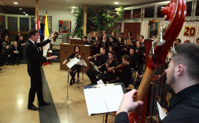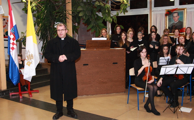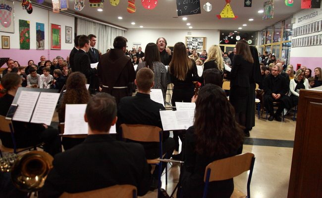 Nastupili su s nekoliko napjeva iz hrvatske tradicijske crkvene baštine i ''Pučki pivači'' KBF-a predvođeni etnomuzikologom Joškom Ćaletom. U slavlju nisu zaboravljeni ni oni potrebni u svijetu što je približeno nazočnima i kratkim videofilmom pa su na kraju koncerta prikupljana sredstva za udrugu ''Marijini obroci'' kojima se osigurava prehrana djeci u školama nekih od najsiromašnijih zemalja svijeta. Projekt je ukratko predstavila koordinatorica projekta ''Marijini obroci Hrvatska'' gđa Ivana Pudić. Program je završio pjesmom u počast župnomu zaštitniku bl. Alojziju Stepincu - Pastiru dobri Alojzije - koju su pjevali i nazočni pa je škola odzvanjala radosnom pjesmom.
