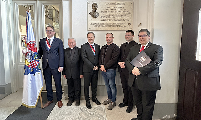 Spomen-ploču, rad akademskog kipara Petra Ćuje, koja sadrži i reljef blaženog Ivana Merza, a koji je rad pok. akademskog kipara i svećenika, p. Marijana Gajšaka SJ, zajednički su postavili Družba „Braća Hrvatskoga Zmaja“ i Postulatura za kanonizaciju bl. Ivana Merza, a otkrili su je Veliki meštar Družbe prof. dr. sc. Mislav Grgić, Zmaj Strossmayerski i postulator prof. dr. sc. p. Božidar Nagy SJ, Zmaj od Slavonskog Broda.