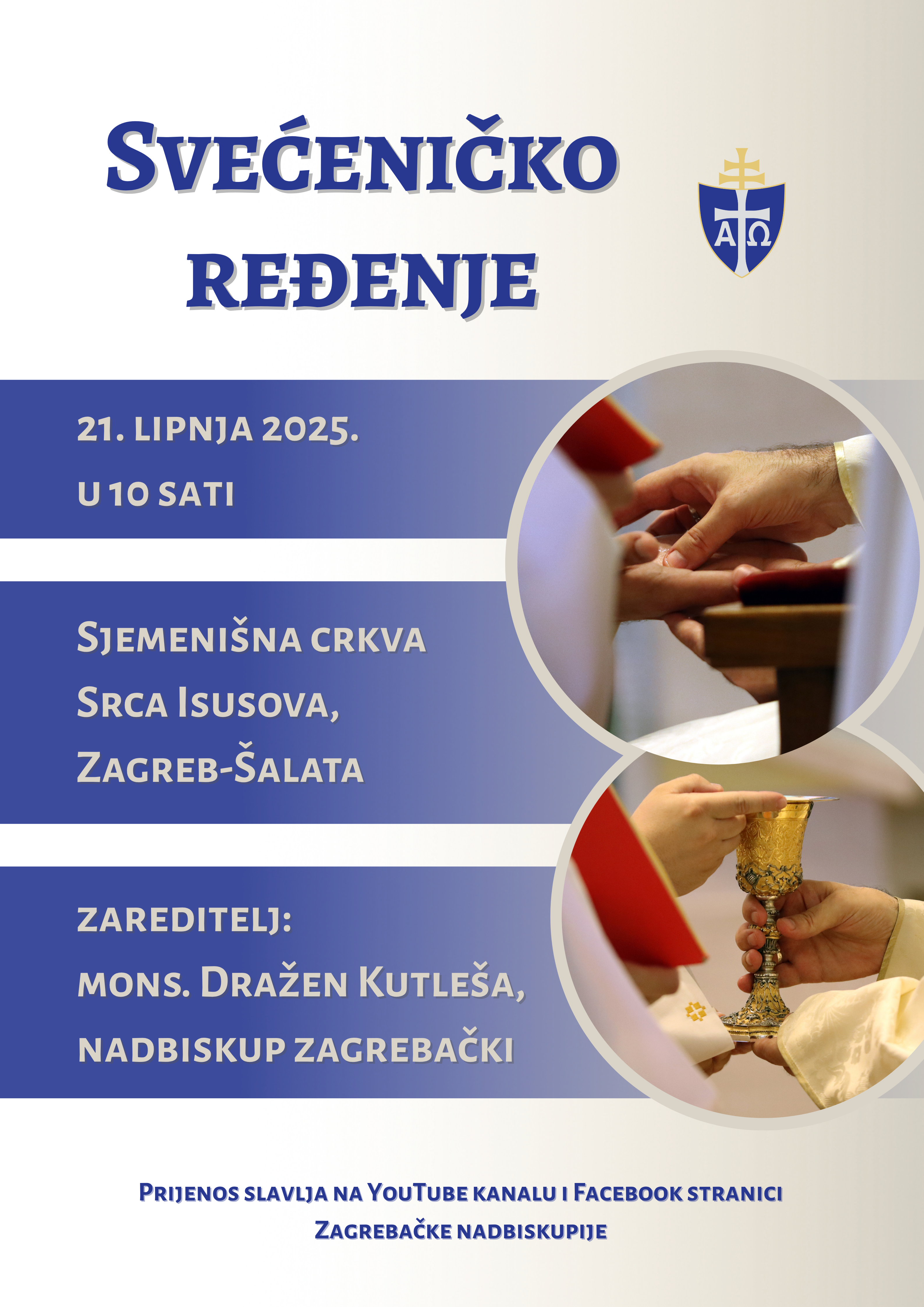 Zagrebački nadbiskup Dražen Kutleša predvodit će u subotu 21. lipnja 2025. godine misno slavlje svećeničkog ređenja u sjemenišnoj crkvi Srca Isusova na zagrebačkoj Šalati (Voćarska 106), s početkom u 10 sati.