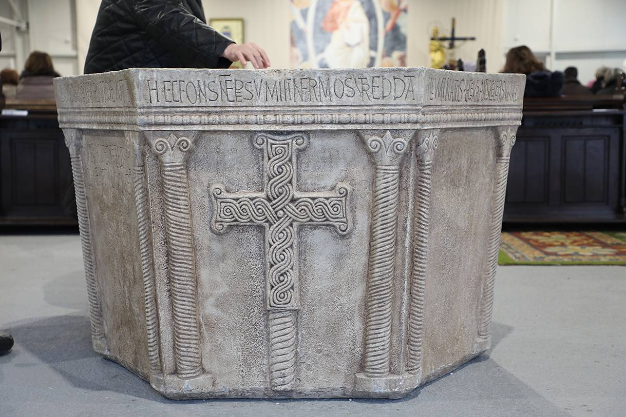 Uz rub krstionice teče natpis na latinskome jeziku, koji je posvetnog značenja pisan u metričkoj formi. U hrvatskome prijevodu glasi: „Ovaj izvor naime prima slabe, da ih učini prosvijetljenima. Ovdje se peru od svojih zločina što su ih primili od svog prvog roditelja, da postanu kršćani spasonosno ispovijedajući vječno Trojstvo. Ovo djelo pobožno učini svećenik Ivan u vrijeme kneza Višeslava, i to u čast svetog Ivana Krstitelja, da zagovara njega i njegova štićenika“. Poruke razumijemo.