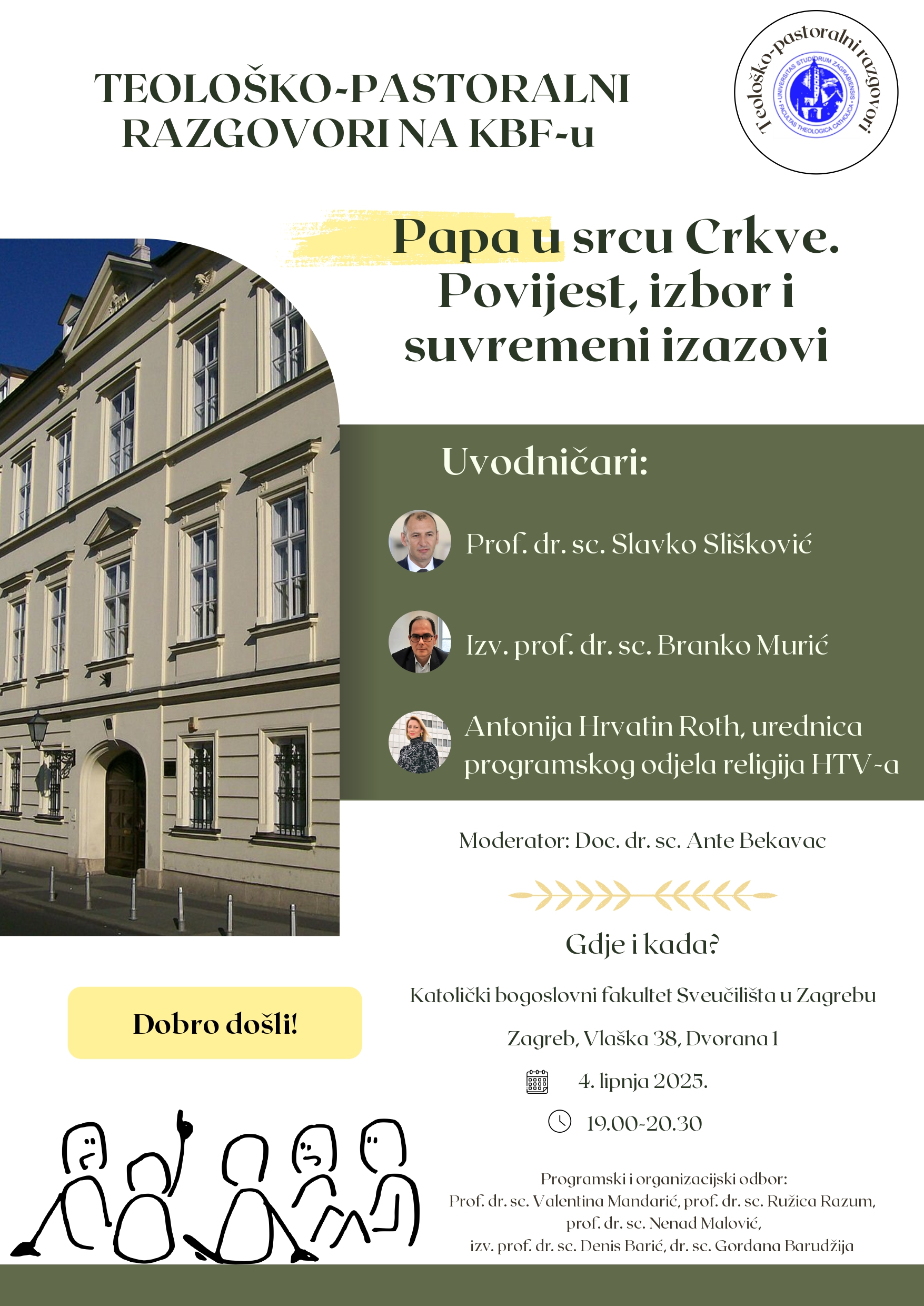 Četvrti po redu Teološko-pastoralni razgovori na Katoličkom bogoslovnom fakultetu Sveučilišta u Zagrebu održat će se 4. lipnja 2025. godine s početkom u 19 sati. Tema razgovora je: "Papa u srcu Crkve. Povijest, izbor i suvremeni izazovi".