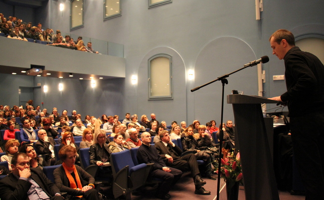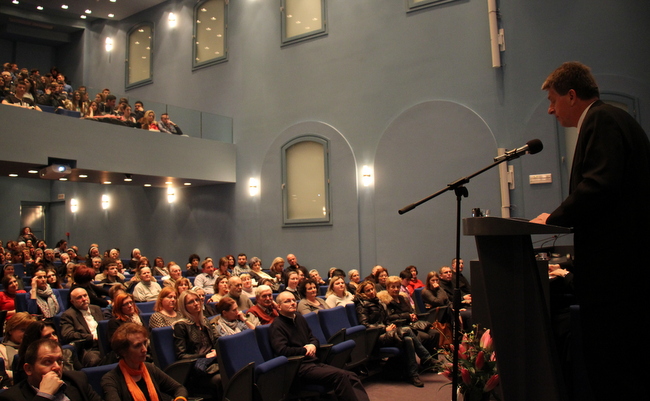 Dvorana Vijenac i ovoga je puta bila gotovo pretijesna ugostivši tristotinjak slušača, među kojima su se i ponovno istaknuli srednjoškolci iz SŠ Jelkovec i VII. gimnazije u pratnji svojih vjeroučitelja, koji su se smjestili na galeriji, a koji su posve zainteresirano slušali što im o savjesti općenito i o savjesti blaženog Alojzija imaju reći dvojica predavača. Njih je posebno pozdravila i u svojem prepoznatljivom stilu u predavanja uvela moderatorica tribina prof. dr. sc. Valentina Blaženka Mandarić. Motivacijski je zanimljiv bio sam početak, kada je u zamračenoj dvorani pušten filmski isječak u trajanju od petnaestak sekundi, u kojem na optužbe koje su protiv njega iznesene blaženik odgovara poznatom izjavom: „Moja je savjest čista“.