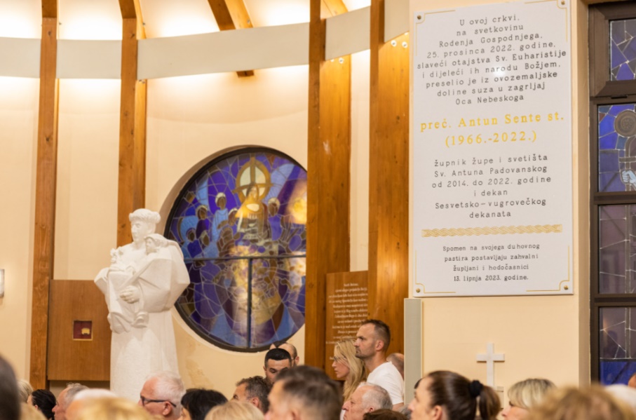 Prije završnog blagoslova, mons. Tomislav Subotičanec, privremeni upravitelj Župe sv. Antuna Padovanskog u Sesvetskim Selima, pred okupljenim župljanima i hodočasnicima spomenuo se na poseban način naglo preminulog župnika preč. Antuna Sentea uvodeći u čin otkrivanja spomen ploče. Pritom je potaknuo okupljene na molitvu za dragog župnika.