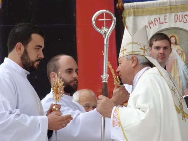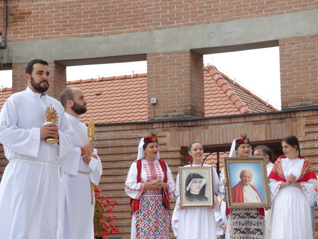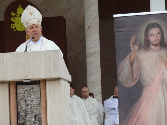Na početku euharistijskog slavlja biskup je pozdravio upravitelja svetišta na odlasku, vlč. Zlatka Korena, kao i novoga, Domagoja Matoševića, potom nacionalnog koordinatora štovatelja Božjega milosrđa, o. Andrzeja Wośka SCJ, i svu braću svećenike. „Pred Marijinim smo likom, ali s nama su tu još dvije osobe, nama drage i svete, a to su sv. Ivan Pavao II., papa, i sv. Faustina Kowalska, redovnica. Njihove moći su danas ovdje s nama. Kao da su osobno prisutni i žele zajedno s nama u ovoj euharistiji upućivati Bogu molitve zahvale i slave“, rekao je uvodno biskup.