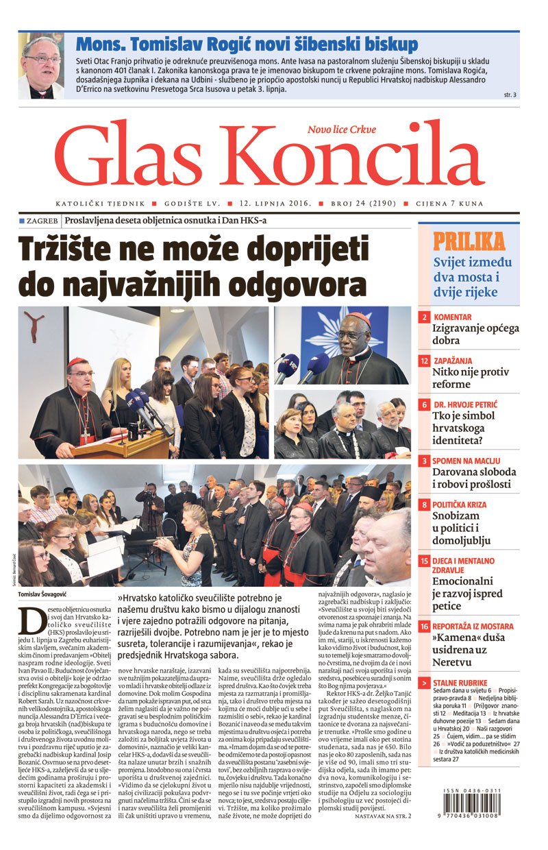 Uz vijest o imenovanju novoga šibenskoga biskupa mons. Tomislava Rogića, središnje mjesto na naslovnici novoga broja Glasa Koncila s nadnevkom od nedjelje 12. lipnja zauzima proslava desete obljetnice osnutka i Dan Hrvatskog katoličkog sveučilišta proslavljen u Zagrebu. Više je ljudi iz crkvenoga i društvenoga života stiglo na obilježavanje toga jubileja, s kojega su poslane poruke kako tržište ne može doprijeti do najvažnijih odgovora, ali i da je važno »ne poigravati se u besplodnim političkim igrama s budućnošću domovine i hrvatskog naroda«.