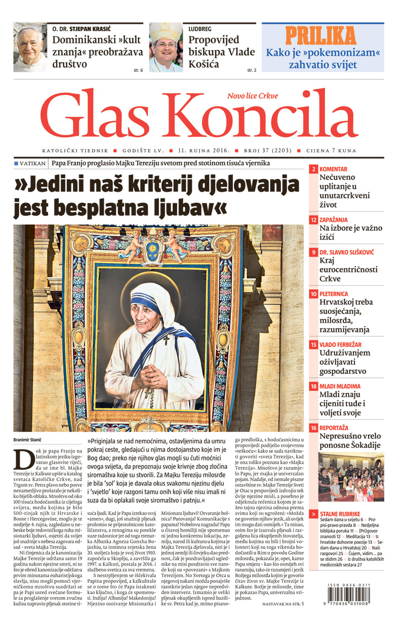 Naslovnicom novoga broja Glasa Koncila s nadnevkom nedjelje 11. rujna dominira naslov "Jedini kriterij djelovanja jest besplatna ljubav", koji govori o proglašenju svetom Majke Terezije u Rimu u nedjelju 4. rujna.