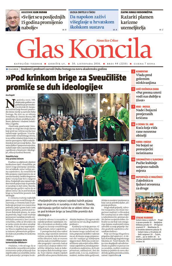 Posljednji listopadski broj katoličkog tjednika Glasa Koncila, otisnut na četrdeset stranica, otvara poruka zagrebačkog nadbiskupa kardinala Josipa Bozanića da se pod krinkom brige za Sveučilište promiče duh ideologije koju je izrekao na misi povodom početka 348. akademske godine.