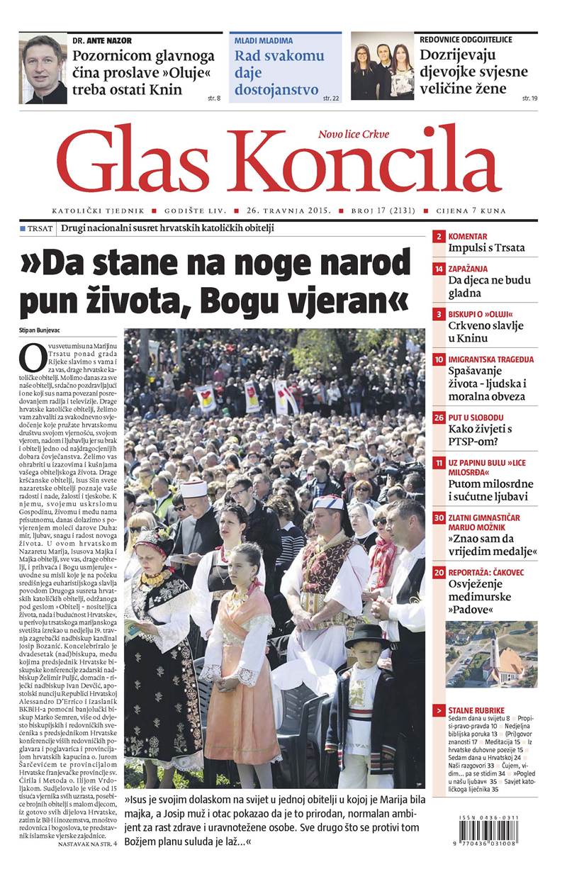 Naslovna stranica posvećena je izvještaju s Drugoga nacionalnoga susreta hrvatskih katoličkih obitelji u svetištu Majke Božje Trsatske u Rijeci, gdje se okupio 15 tisuća vjernika koje je Crkva ohrabrila na njihovom obiteljskom putu. Sa susreta je posebno odjeknula poruka da bi se mnoga sredstva trebala preusmjeriti na dobro obiteljima, umjesto da se troše u beskorisne, moralno štetne i zanemarive svrhe, a na stranicama GK-a atmosfera se prenosi i na desetak fotografija.