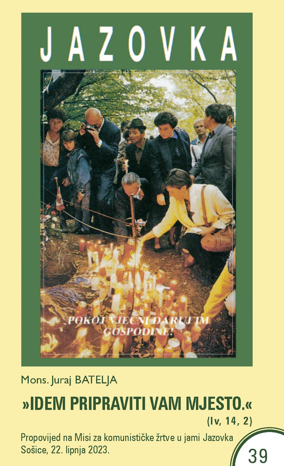 Na kraju mise bit će predstavljena propovijed mons. dr. Jurja Batelje koju je održao u sklopu spomen-slavlja i svečane euharistije pokraj jame Jazovke u četvrtak 22. lipnja 2023. Tekst homilije otisnut je u maloj knjižici i moći će ju se besplatno uzeti nakon predstavljanja.