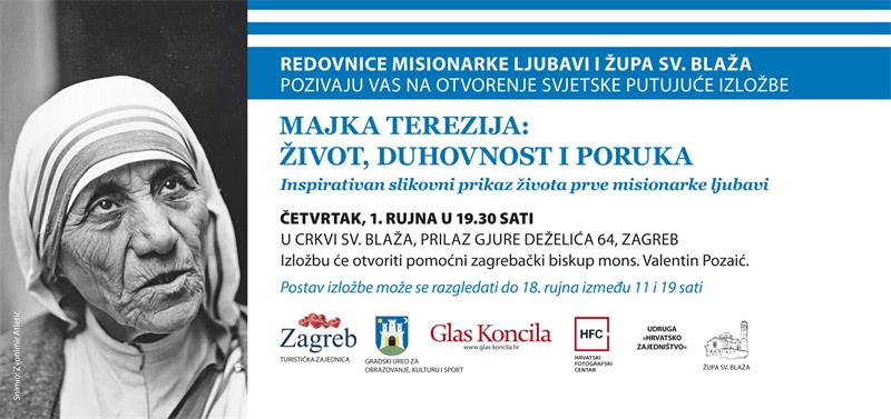 U Zagreb stiže velika svjetska putujuća izložba fotografija »Majka Terezija: Život, duhovnost i poruka« koja se postavlja uoči njezinog proglašenja svetom prve rujanske nedjelje. Istovremeno s rimskim otvaranjem izložbe o životu i djelovanju nove svetice Katoličke Crkve i velike dobrotvorke, u četvrtak 1. rujna u 19.30 sati u crkvi sv. Blaža u Zagrebu, Prilaz Gjure Deželića 64, priređuje se svečanost otvaranja na kojoj će sudjelovati pomoćni zagrebački biskup mons. Valentin Pozaić, predstavnici diplomatskog zbora te osobe iz crkvenog i društvenog života.