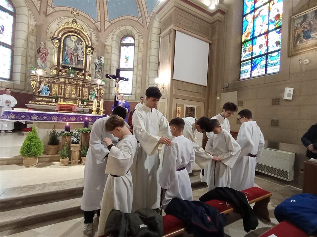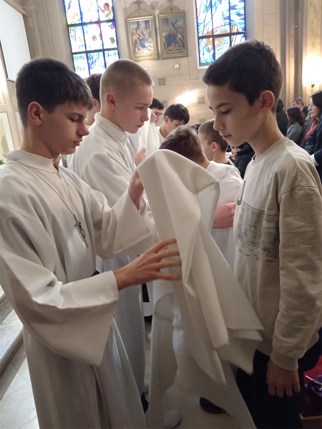 Župnik Koprivec blagoslovio je njihovo ministrantsko ruho nakon čega su ga odjenuli, u čemu su im pomogli stariji ministranti kojima su se pridružili u službi oko oltara.