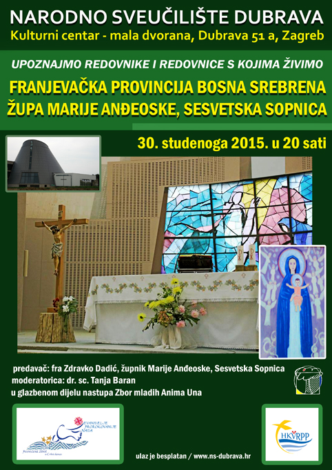 u ponedjeljak, 30. studenog 2015. u 20 sati, u maloj dvorani Kulturnoga centra, Dubrava 51 a (uz Dom zdravlja u Dubravi) predstavit će se Provincija Bosna Srebrena - Župa BDM Anđeoske iz Sesvetske Sopnice.