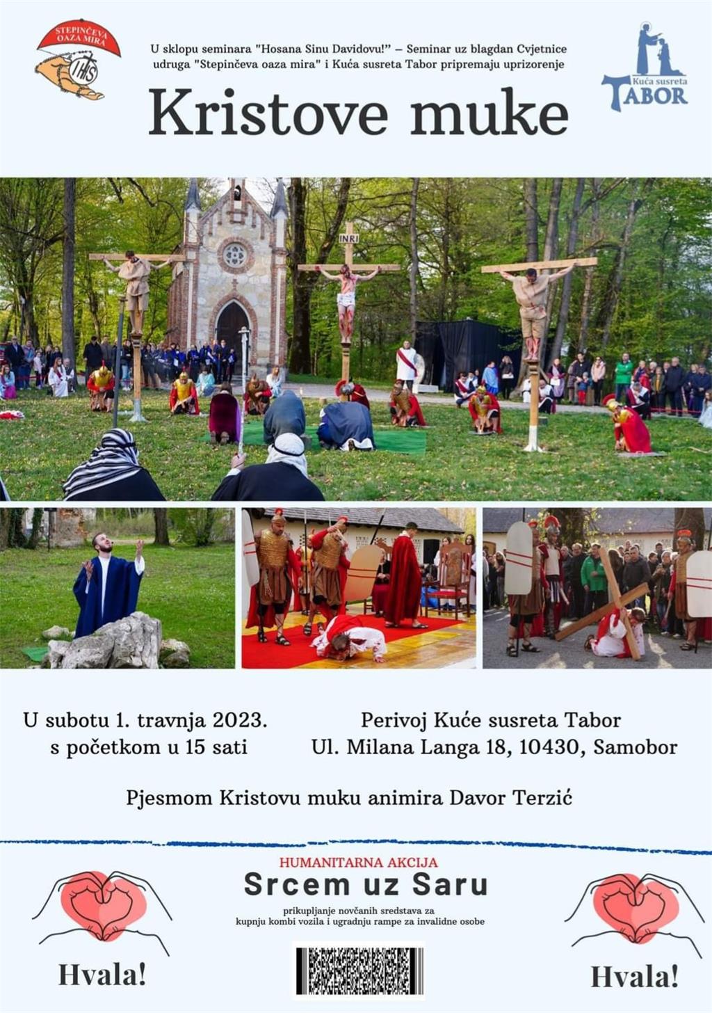 U Kući susreta Tabor u subotu 1. travnja s početkom u 15 sati, u sklopu seminara "Hosana Sinu Davidovu" - Seminar uz blagdan Cvjetnice, udruga "Stepinčeva oaza mira" iz Zaprešića i Kuća susreta Tabor pripremaju uprizorenje Kristove muke.