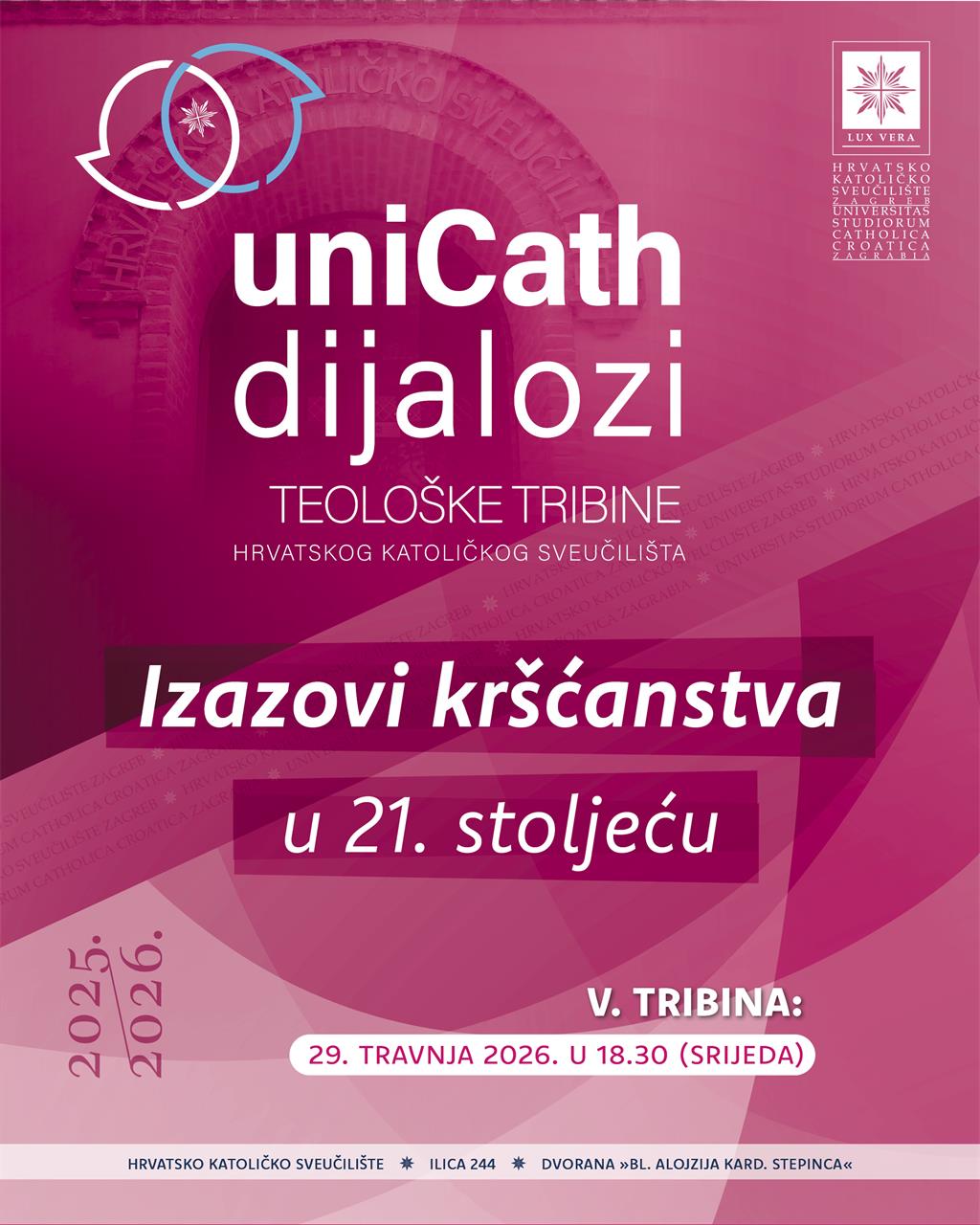 Unicath dijalozi "Izazovi kršćanstva u 21. stoljeću" održat će se u srijedu 29. travnja s početkom u 18.30 sati u dvorani "Blaženi Alojzije kard. Stepinac" na Hrvatskom katoličkom sveučilištu. Na tribini će sudjelovati rektor Hrvatskog katoličkog sveučilišta prof. dr. sc. Željko Tanjić i Matija Štahan, književni kritičar, esejist i publicist.