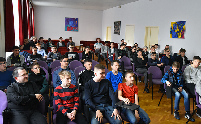 Nakon što je na početku rektor Sjemeništa, preč. Matija Pavlaković, srdačno pozdravio voditelja duhovne obnove i okupljene dječake, poželjevši im dobrodošlicu i ugodan boravak u Sjemeništu, vlč. Leonardo započeo je program duhovne obnove te u uvodnom nagovoru u kratkim crtama iznio svoj put ostvarenja svećeničkog poziva. Zatim je na temelju evanđeoskog odlomka o susretu Isusa sa slijepcem Bartimejem (Mk 10, 46-52) iznio niz poticaja vezanih uz naš odnos prema onima koji su na periferiji društva, ali koji su neizmjerno važni u Isusovim očima. Za druge ljude je, naime, Bartimej bio tek slijepac pokraj puta, ali za Isusa on je bio osoba koja ima ime i koja je vrijedna ljubavi i pažnje, i zato je upravo njega stavio u središte svoje pažnje, a time posljedično i pažnje svojih učenika.