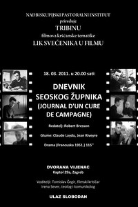 Tribina će se održati u petak, 18. ožujka 2011. godine u dvorani „Vijenac“, Kaptol 29a s početkom u 20 sati. Bit će prikazan film „Dnevnik seoskog župnika“ redatelja Roberta Bressona. U filmu glume Claude Laydu, Jean Riveyre.