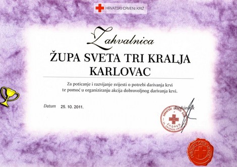 U utorak, 25. listopada 2011. godine, župa sveta Tri kralja Banija- Karlovac primila je od Hrvatskog Crvenog Križa i Gradskog društva Crvenog Križa Karlovac, Zahvalnicu za poticanje i razvijanje svijesti o potrebi darivanja krvi te pomoć u organiziranju akcija dobrovoljnog darivanja krvi.