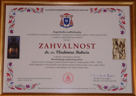 Tom prigodom, mons. Šaško je dr. Babušu izrazio zahvalnost za iskazanu nesebičnost i zauzetost u promicanju i obogaćivanju liturgijske glazbe u Zagrebačkoj nadbiskupiji, a osobito u zagrebačkoj prvostolnici kao voditelju i poticatelju osnivanja Katedralnog mješovitog zbora, kojim je ravnao od njegova početka punih dvadeset i sedam godina (1985. – 2012.), te mu uručio prigodnu povelju potpisanu od zagrebačkoga nadbiskupa kardinala Josipa Bozanića.