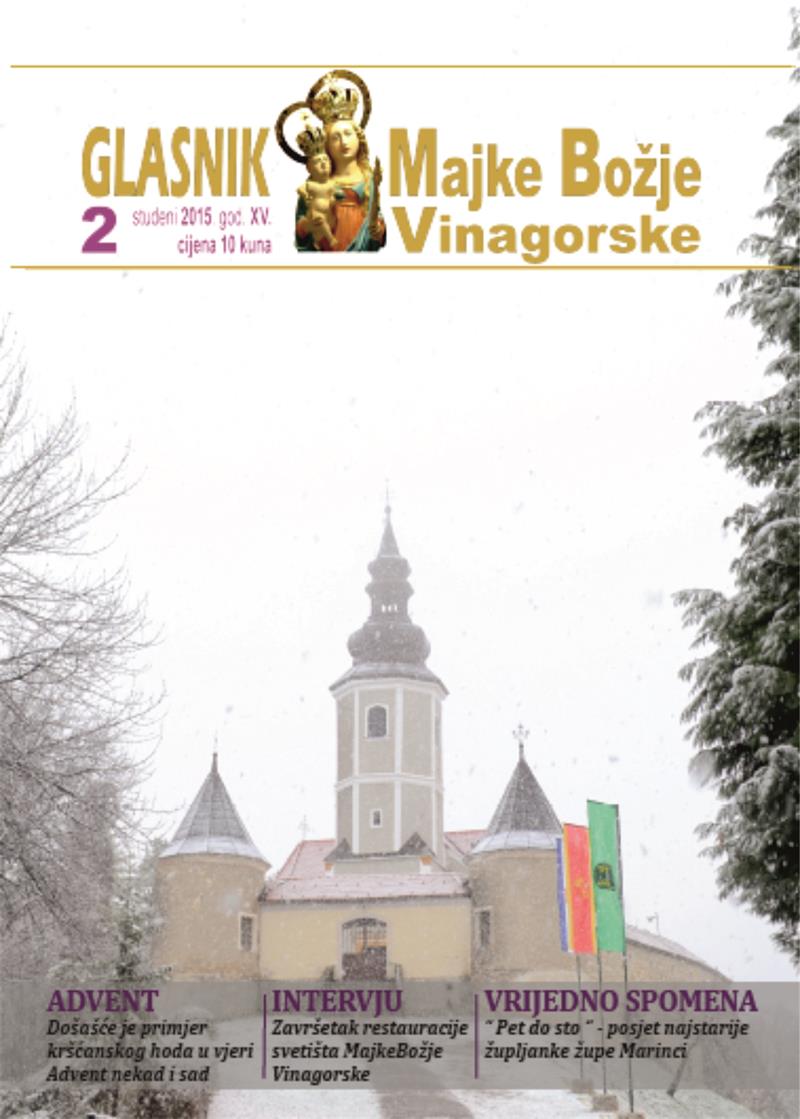 Prvim brojem započeli smo novo vrijeme “Glasnika” s nadom i vjerom da nikada više neće biti prisilno prekinuto njegovo izlaženje. Kako je kroz to “vrijeme praznine” svijet napredovao u tehnici i razvio alternativne načine komunikacije, “Glasnik” više nije jedini izvor informacija i povezanosti s Vinagorom, što je bila njegova prvotna namjena. Naime, “Glasnik” je svoje čitatelje nalazio kako u domovini, tako i diljem svijeta, ponajviše u Kanadi i Americi. No bez obzira na novonastale okolnosti, on će i dalje u prvom redu donositi vijesti i događaje s Vinagore, ali će opširnije pisati i o drugim temama vezanima uz naš vjernički život. Ovaj drugi broj izlazi na početku nove liturgijske godine i obuhvaća Božićni ciklus, pa ćete tako moći pročitati nešto više o adventu i adventskim običajima, Božiću, i još nekim zanimljivim temama.
