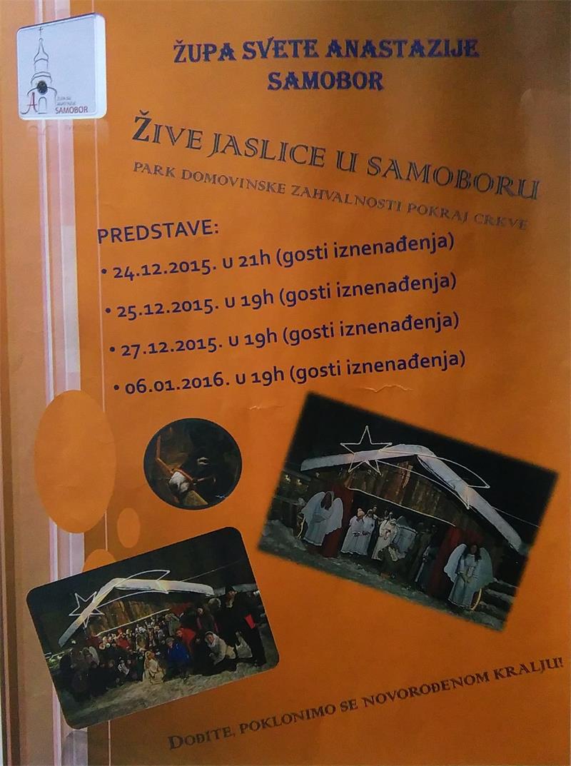 svetkovina Bogojavljena, 6. siječnja 2016. u 19 sati. Na svakoj od izvedbi sudjelovat će posebni „gosti iznenađenja“: na Badnjak poznati hrvatski pjevač duhovne i zabavne glazbe Alen Hržica, a u ostalim izvedbama gosti iz župa: Sveta Nedelja, Domaslovac, Lug Samoborski i Zagreb-Kustošija.