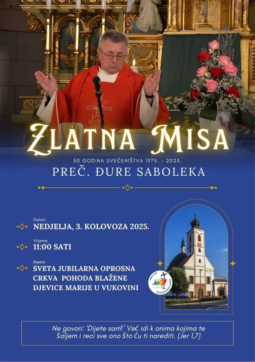Zlatna misa preč. Đure Saboleka održat će se u nedjelju 3. kolovoza u 11 sati u svetoj jubilejskoj oprosnoj crkvi Pohoda Blažene Djevice Marije u Vukovini.