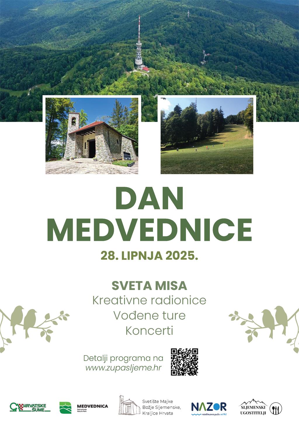 Župa Majke Božje Sljemenske, Kraljice Hrvata, u suradnji s Hrvatskim šumama, Parkom prirode Medvednica, Šumarijom Zagreb i sljemenskim ugostiteljima organizira "Dan Medvednice" u subotu 28. lipnja 2025. na Sljemenu. U 12.30 sati služit će se svečana sveta misa u kapeli Majke Božje Sljemenske.