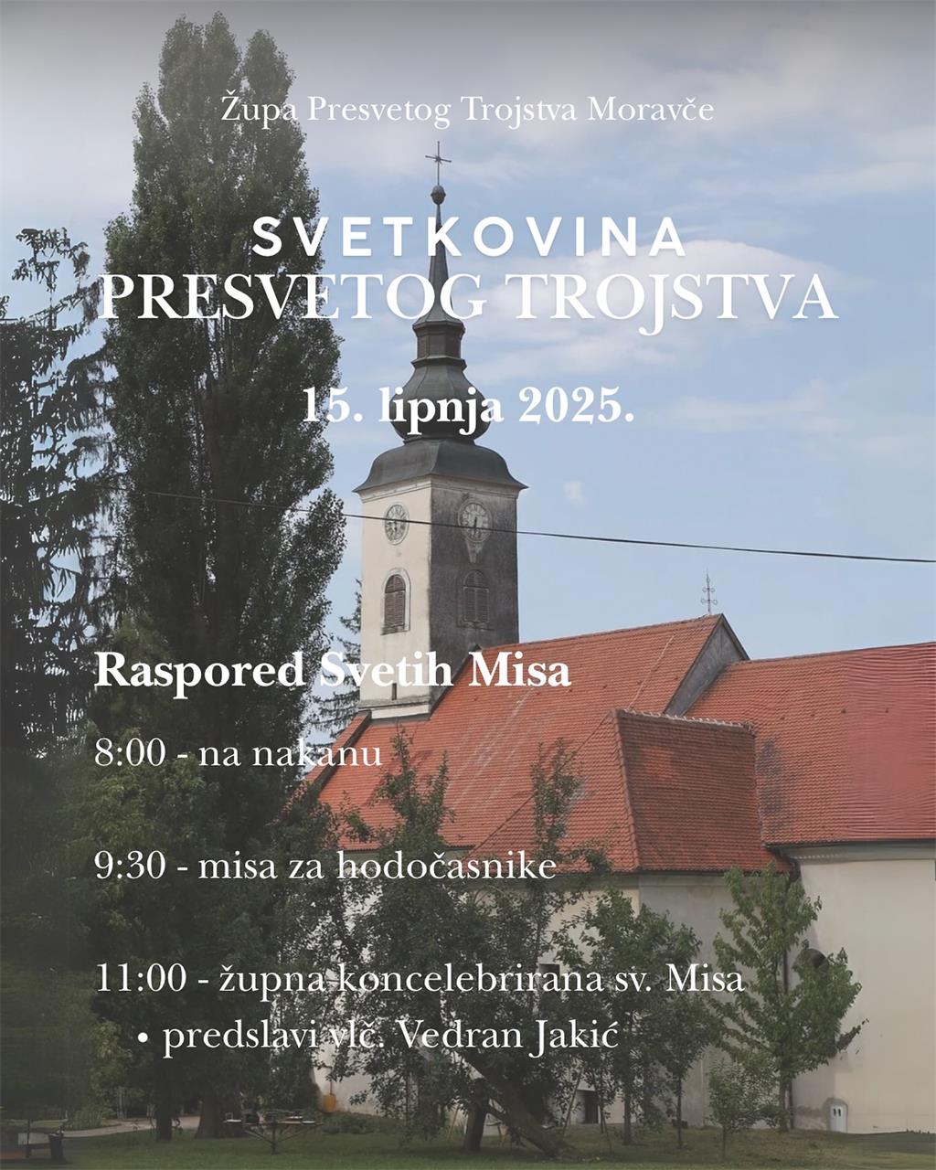 Župa Presvetog Trojstva - Moravče proslavit će župnu svetkovinu u nedjelju 15. lipnja 2025. Toga dana slavit će se tri svete mise: u 8 sati, u 9.30 sati će biti hodočasnička misa, a u 11 sati središnje euharistijsko slavlje predvodit će vlč. Vedran Jakić, župni vikar Župe Uznesenja BDM u Mariji Bistrici.