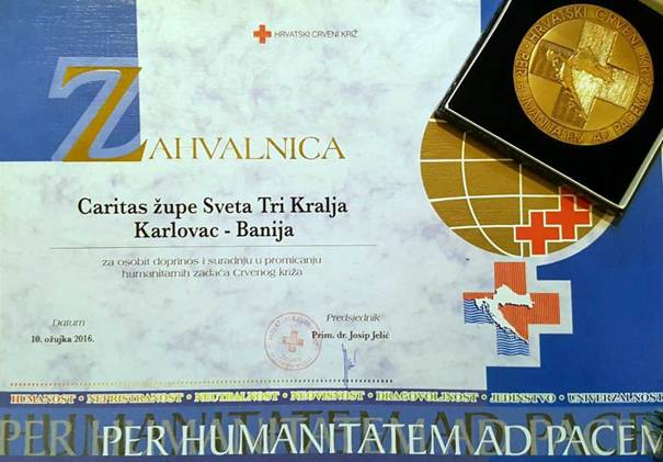 Na proslavi 135. obljetnice rada Gradskog društva Crveni križ Karlovac, u četvrtak 15. prosinca 2016., Caritasu župe sv. Tri kralja, Karlovac – Banija uručeno je priznanje za uspješnu dugogodišnju suradnju.